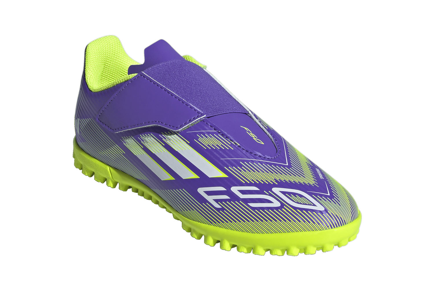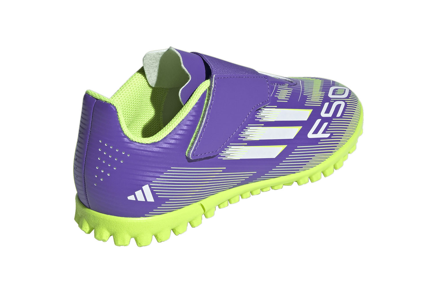 Trova la velocità per esprimere al meglio te stesso in campo. Senti l'adrenalina con le scarpe adidas F50, progettate per la velocità. Queste scarpe da calcio junior Club ti offrono il massimo comfort in movimento grazie alla tomaia sintetica testurizzata e all'ampio cinturino a strappo. Girale e scoprirai una suola in gomma zigrinata che supporta il gioco veloce sui campi in erba sintetica.