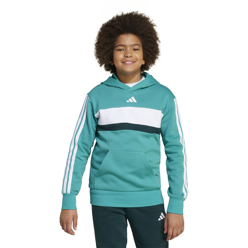 Questa felpa con cappuccio adidas junior ridefinisce lo stile contemporaneo con 3 strisce lungo le maniche e un accattivante motivo colorblock. La morbida struttura in tessuto felpato e gli orli a coste trattengono il calore all'interno. Un capo perfetto da aggiungere al tuo guardaroba casual.