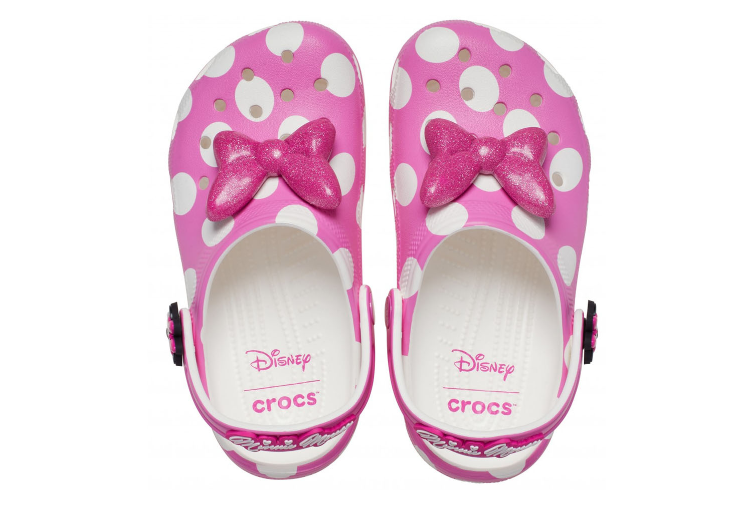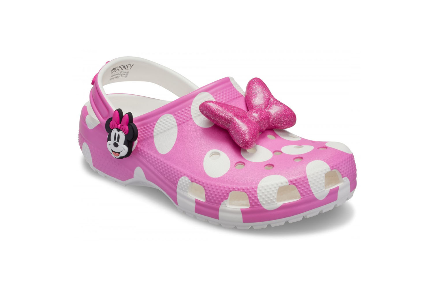 Yoo-hoo, è il Kids Minnie Mouse Classic Clog della collezione Disneys Mickey & Friends! Questo adorabile Classic Clog è progettato ispirandosi allo stile iconico di Minnie Mouse, con una stampa a pois rosa e un grande fiocco rosa glitterato applicato sulla tomaia di ogni scarpa. Il volto di Minnie impreziosisce ciascun rivetto, mentre la sua firma è presente sul cinturino posteriore.