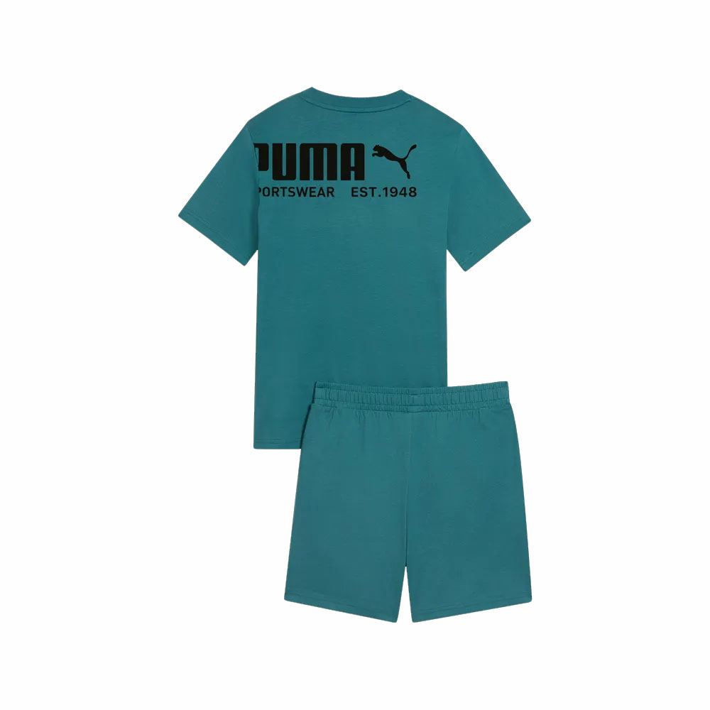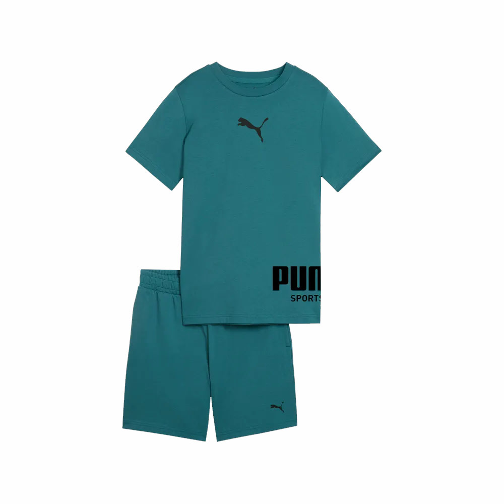 Completino PUMA Sport Graphic Relaxed per bambino e bambina. Realizzato in morbido cotone, garantisce comfort e traspirabilità per tutta la giornata. La t-shirt presenta logo Puma sul petto e maxi stampa grafica con lettering "PUMA Sportswear Est. 1948", per un tocco deciso e riconoscibile. Gli shorts, con vita elasticizzata, completano il set con praticità e libertà di movimento.