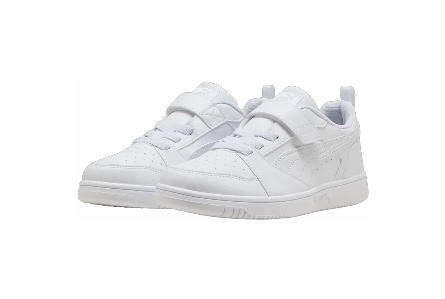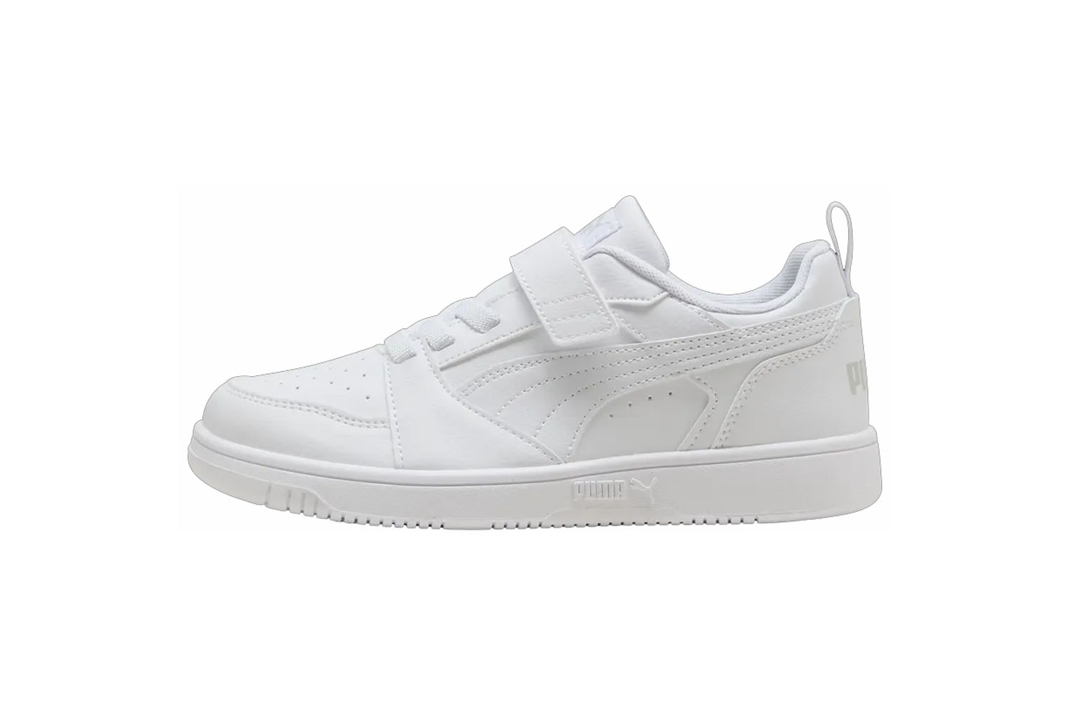 Puma Rebound v6 Lo Ac BambiniScarpe da bambino.Tomaia in pelle sintetica, chiusura a strappo con vecro e lacci elastici.Colore PUMA White-Cool Light Gray