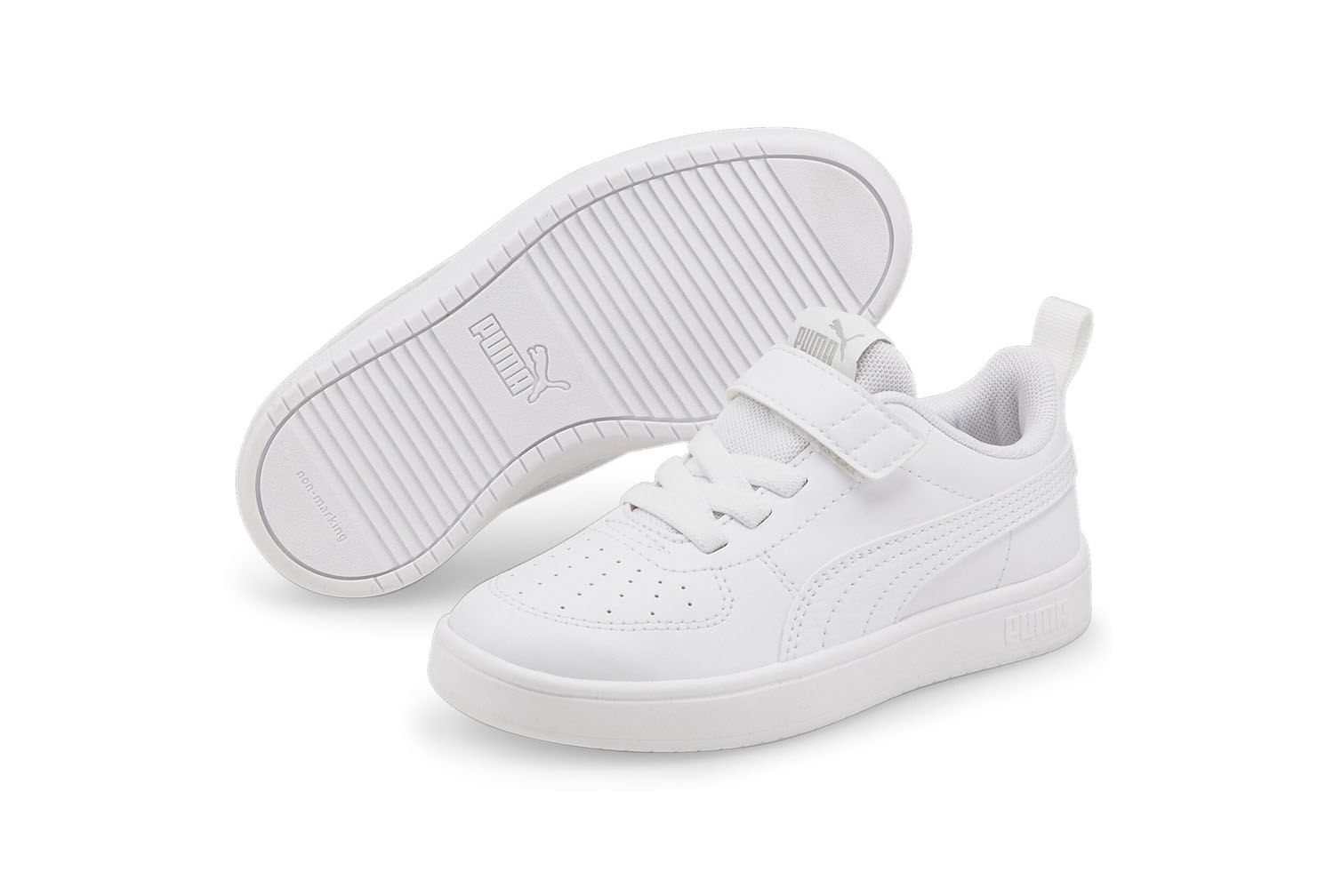 Puma Rickie AC BambiniScarpe da bambino per lo sport e per il tempo libero.Tomaia in pelle sintetica, chiusura a strappo con velcro, suola in gomma.Colore Prodotto Puma White-Puma White-Glacier Gray